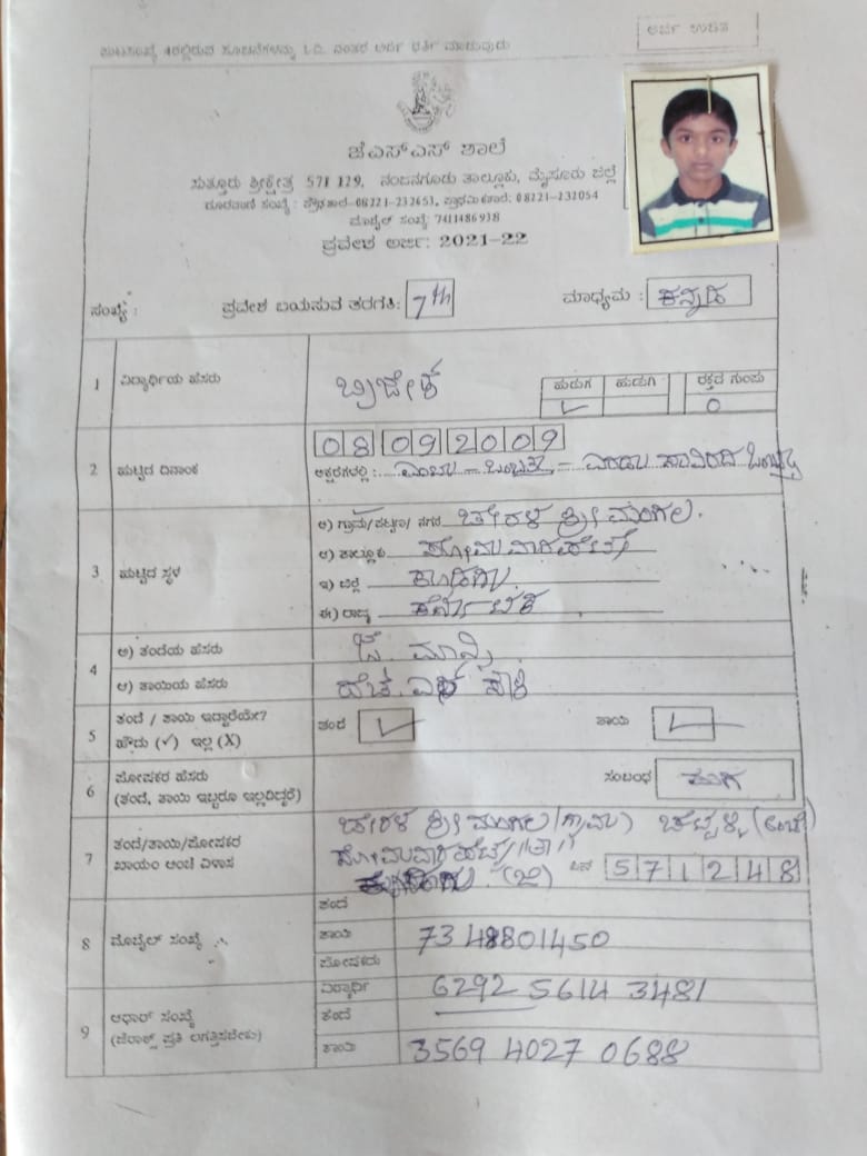 ON 24.09.2021 FEES FOR MST BRIJESH WAS PAID FOR 7TH STANDARD AT SUTTUR MUTT .SPONSORED BY G.R PANKAJA