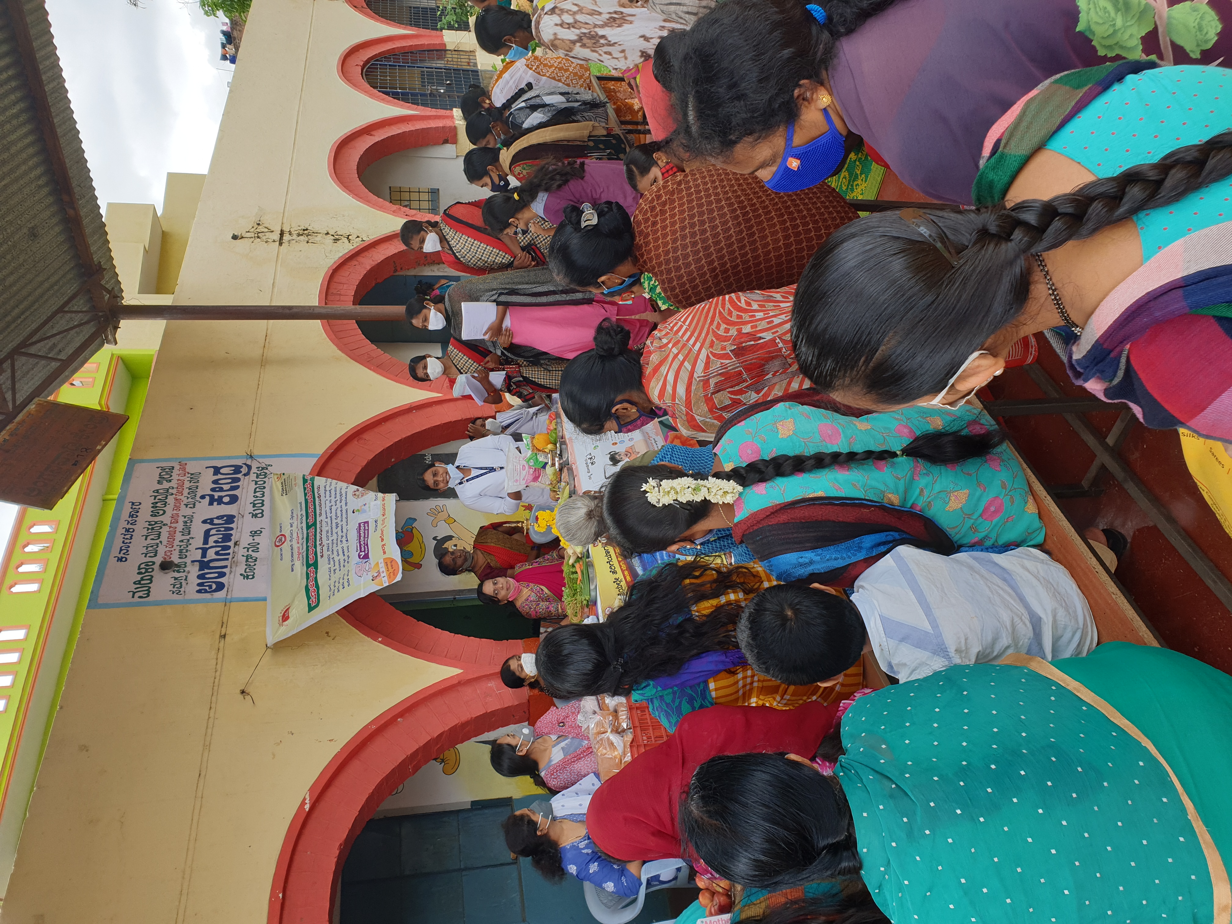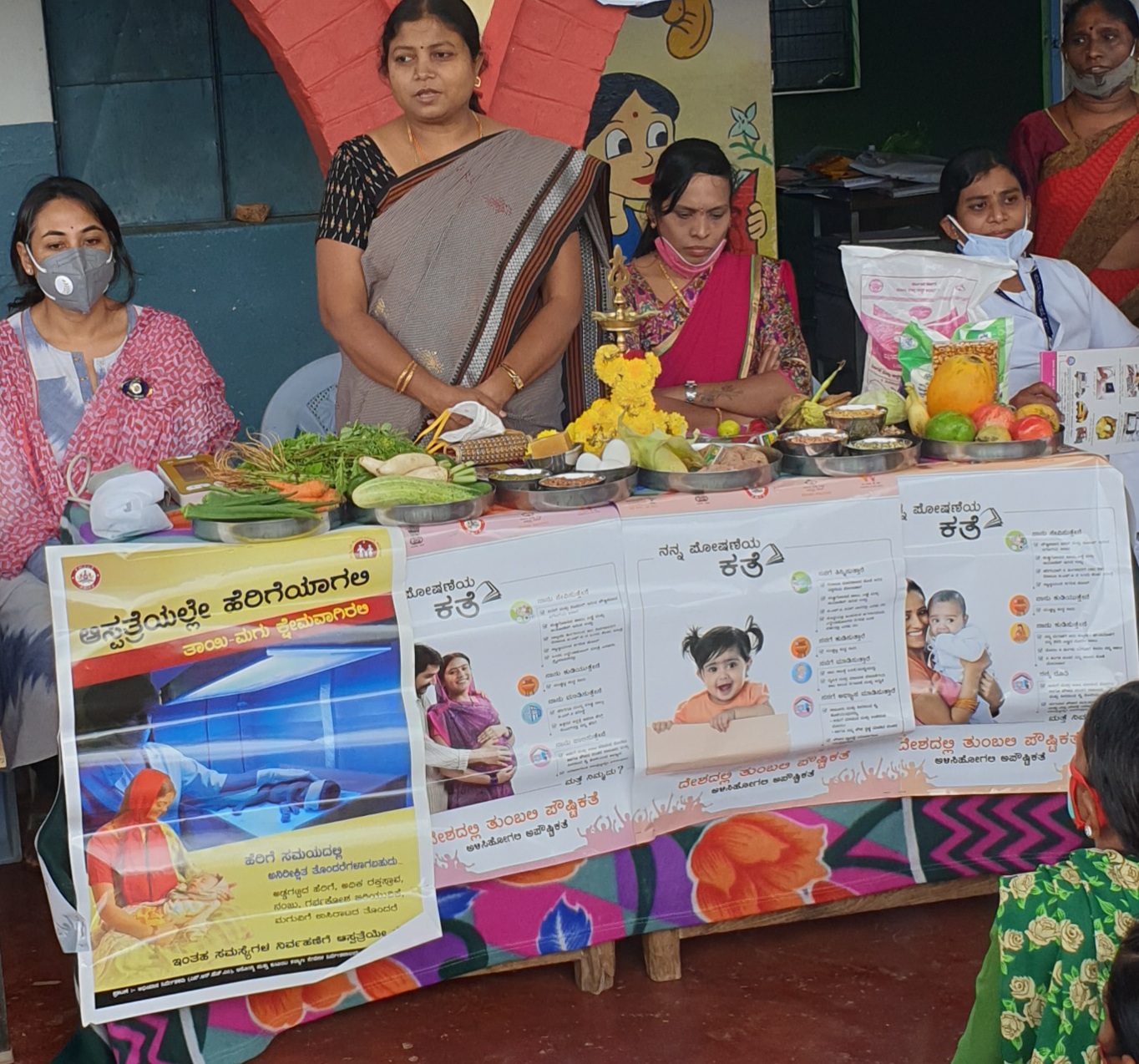 A nurse from the Primary Health Centre in Kurbarhalli spoke about the benefits, and the effective method of feeding a new-born. She also highlighted the importance of nutrition by organising a special lecture on Iron deficiency anaemia (IDA). Fruits, vegetables, pulses, and cereals that are necessary during and after pregnancy were bought and displayed to highlight the importance of nutrients in the diet to prevent anaemia.