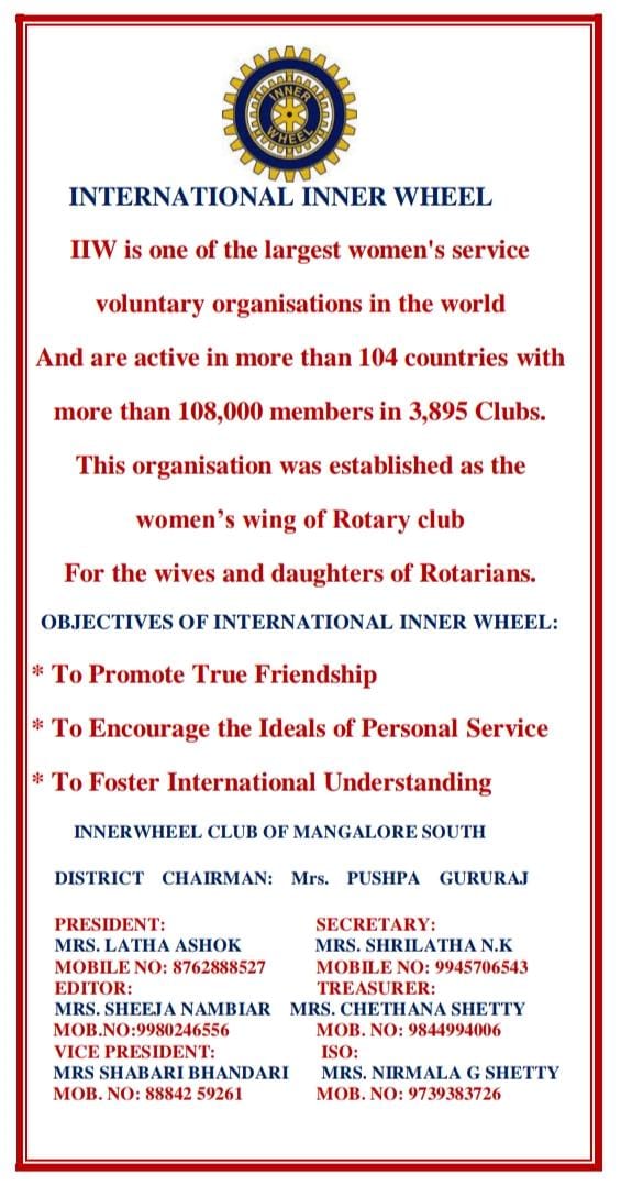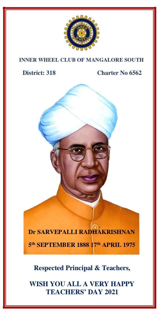 Teachers' day cards are sent to 50 schools and PU colleges in and around Mangalore. A brief description about the Inner wheel and the details of club officers are printed at the backside.