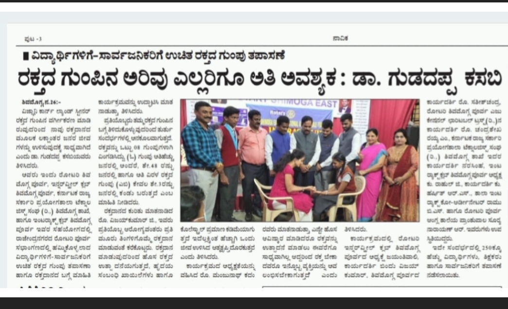 Joining hands with Rotary club of Shimoga East, we had organized a Free blood group testing and awareness programme, "why we should donate blood" for students of Rotary school and publics. Dr. Gudadappa was the resource person of this programme.