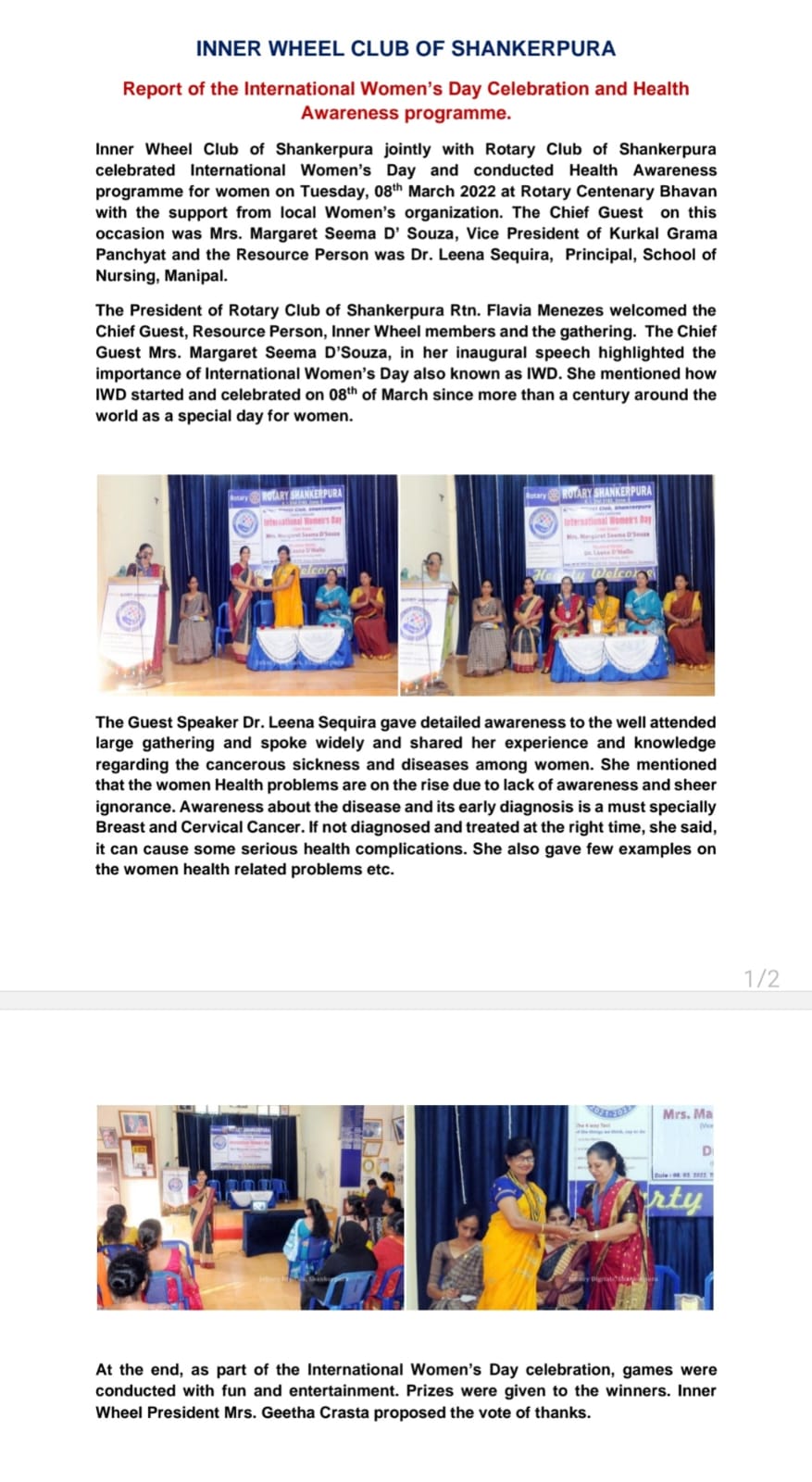 IW club and Rotary club of Shankerpura together celebrated international women's day on 8th March