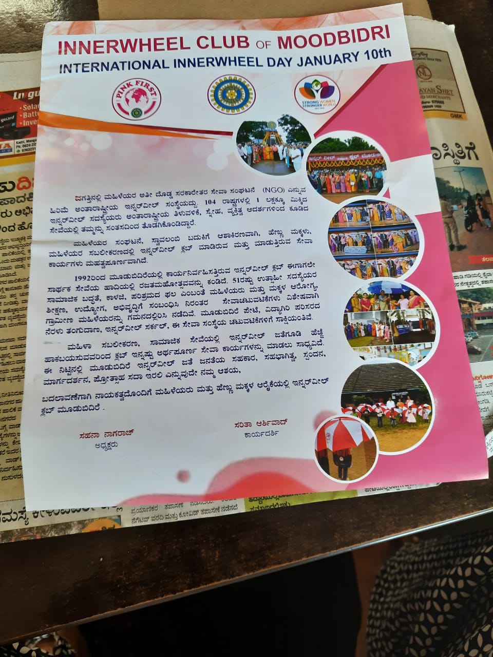On 10th Jan 2022, On account of International Inner Wheel day on all leading Kannada newspaper we branded Inner wheel by giving information and History through pamphlets. More than 5000 pamphlets were distributed in and around Moodbidri.