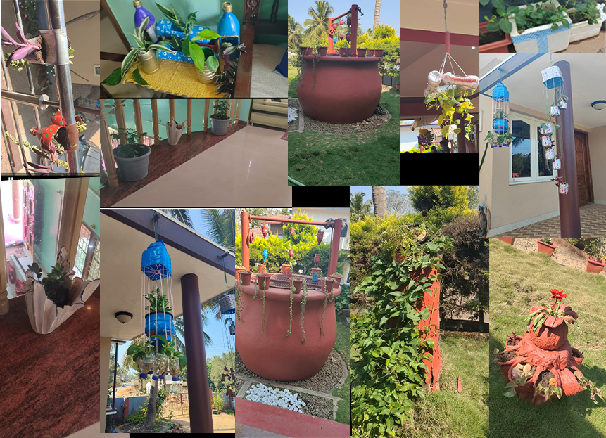 one of our club member has converted and reused the water bottles, cans, tyres, thermocol into growing plants with paintings and design on that. She has pretty tiny garden at her home. we all members had visited her home to encourage and motivate her art. and also we had a delicious lunch at her home. it was like a gettogether and refreshment trip at her home.