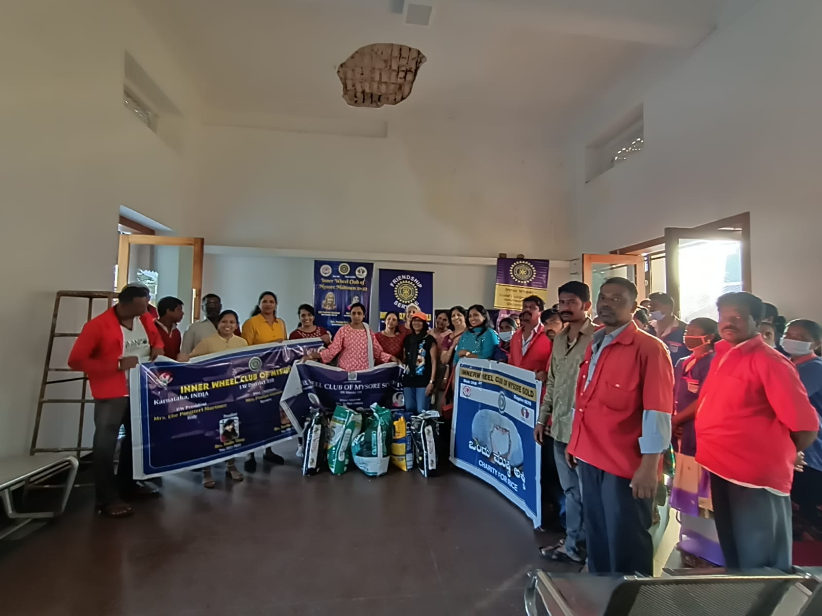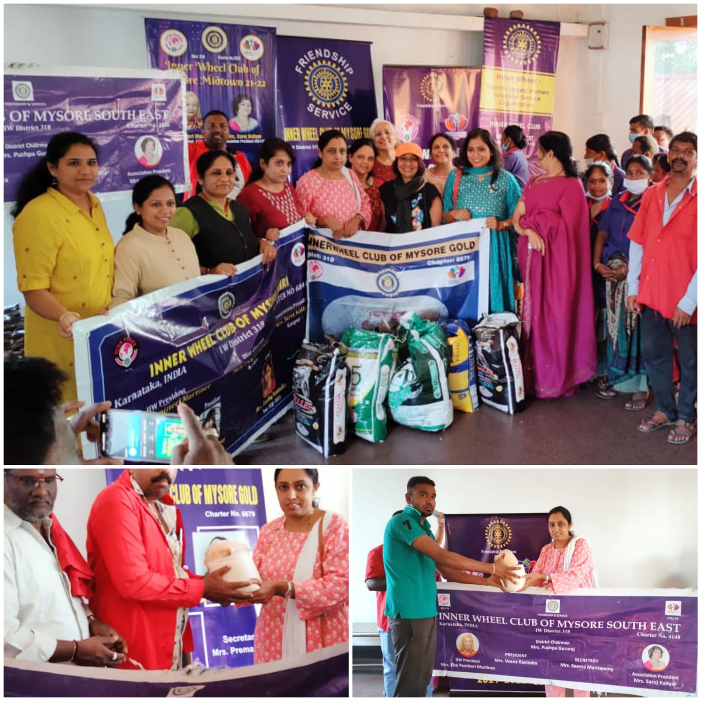 All the 8 clubs of Inner wheel Mysore donated Rice and toor dal to coolie workers and helpers of Mysore Railway station.2.5 kg of rice and 1 kg of toor dal each were donated to 80 coolie workers and women helpers.