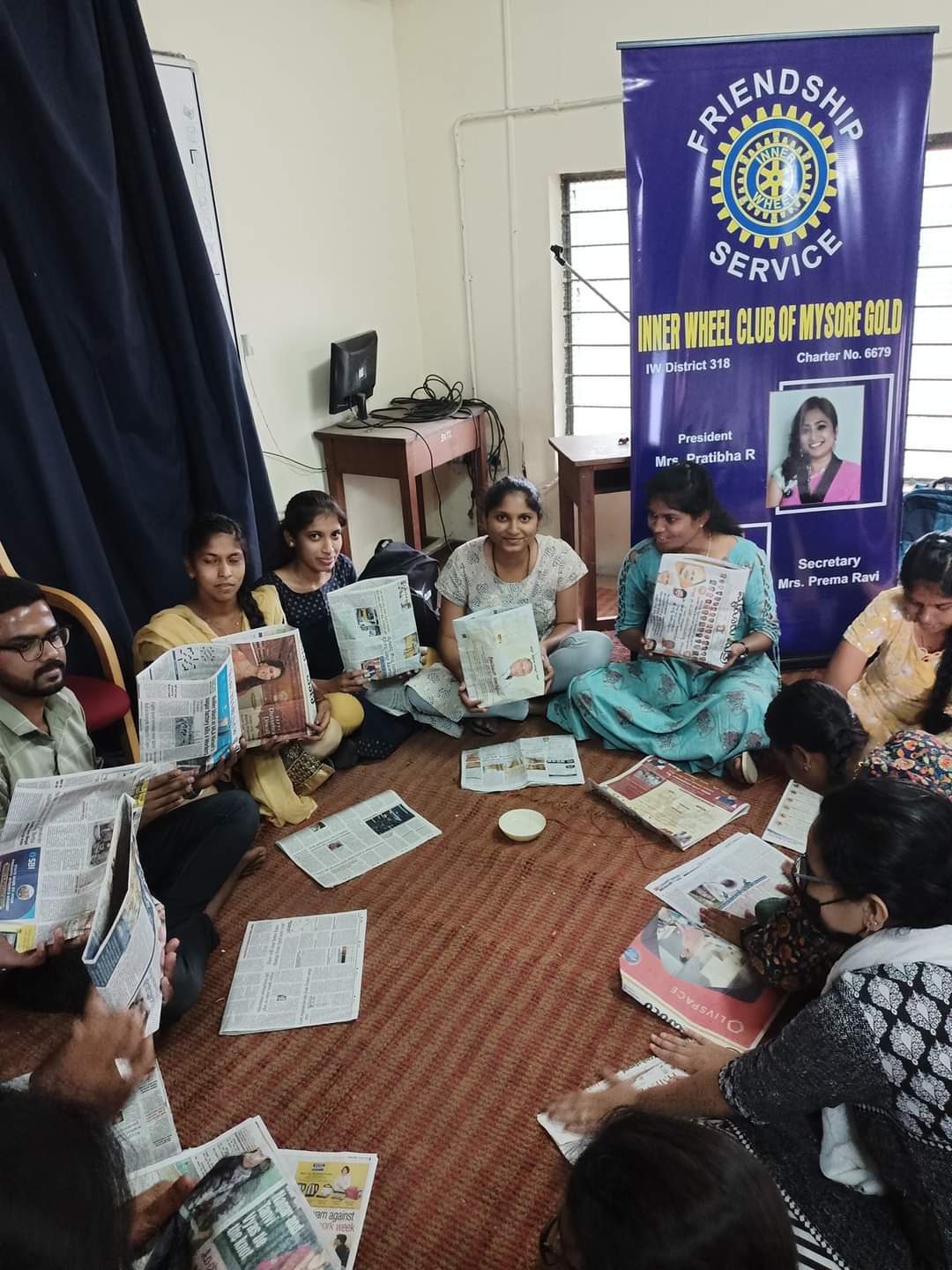 To avoid plastic bags ,to save mother Earth and to reuse,renew and recycle newspapers Iwc Mysore gold organised organised workshop on paper bags from news paper.The workshop was conducted in Sharada vilas Bed college,mysore.A total number of 150 students participated.Prabhamani .S from sevayaana trust Mysore taught the students to make paper bags.