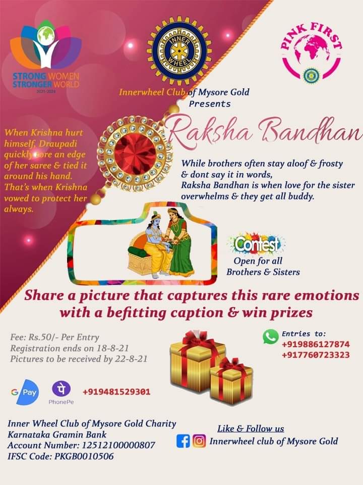 IWC mysore glold organised a competion on rakshabandhan.The best pic tying Rakhi to with best caption was awarded.We recieved almost 30 entries. winners were chosen by our honorary member and judge ex RJ Roopashree.The winners were