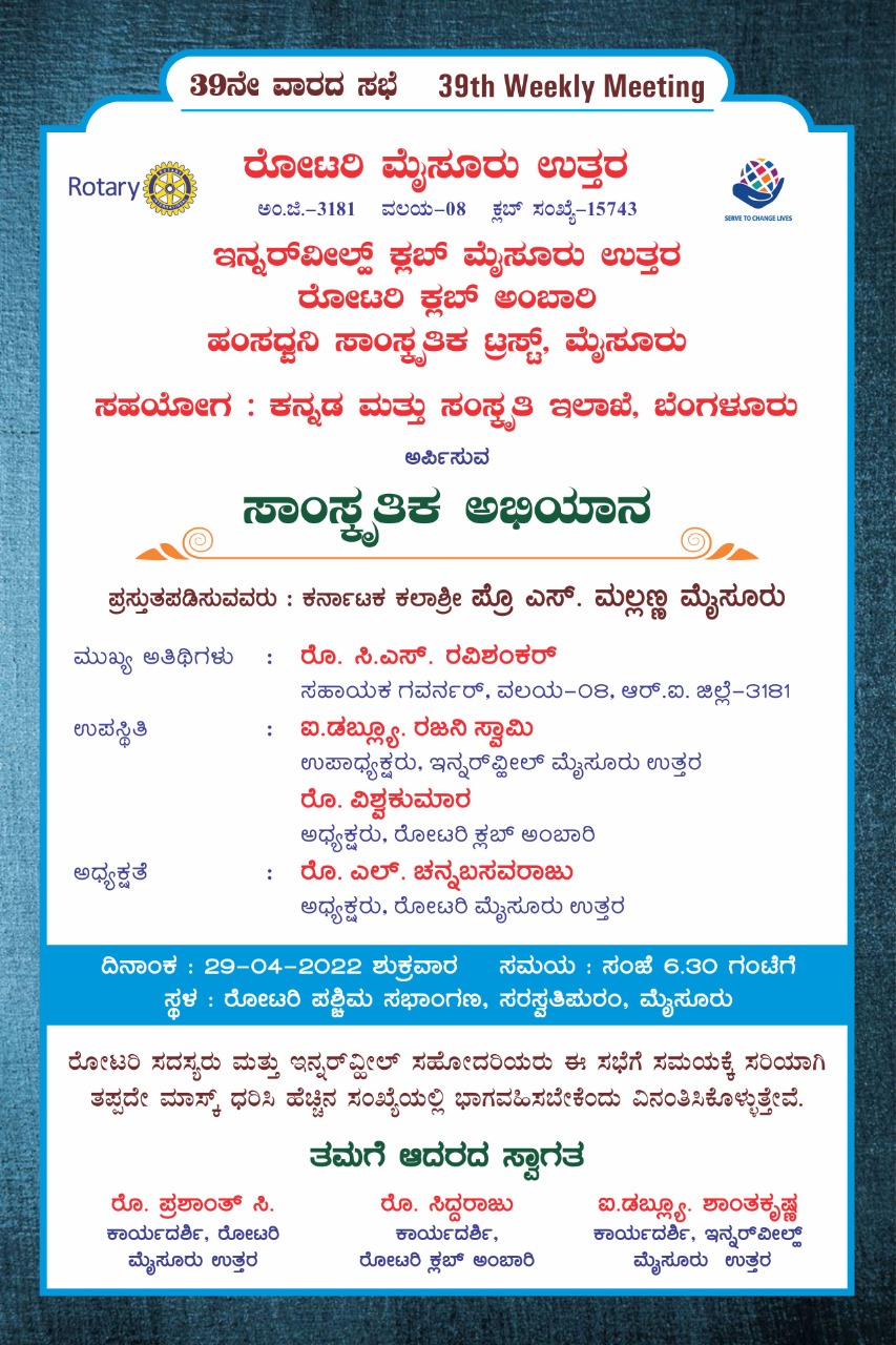 We had a musical extravaganza by Karnataka Kalashri S Mallanna who is known as Junior Kalinga Rao.Rotary members together sang a few songs .It was a joint project...Inner Wheel Club Mysore North, Rotary club North and Rotary Ambari. S Mallanna was honoured at the last.