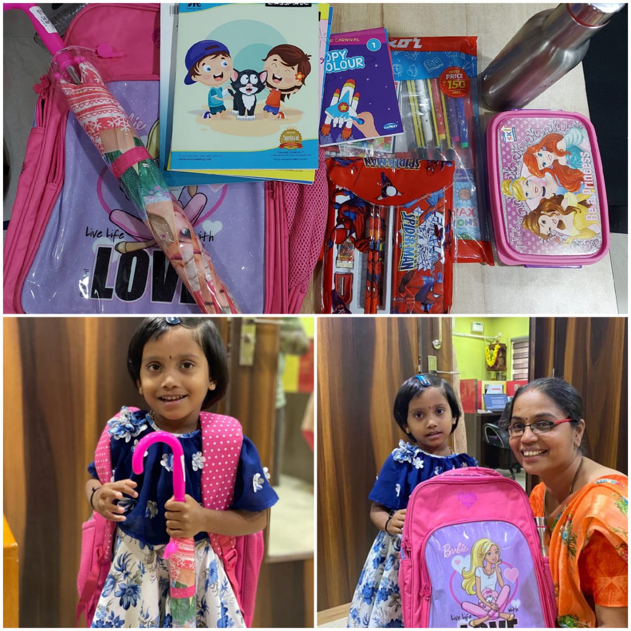 We wanted to support Nikita -Daughter of a security guard who enrolled her daughter to school and wanted to educate her. On the first day of school, we wanted to bring smiles on her face with new bag, Lunch box, Bottle, umbrella, books and stationery.