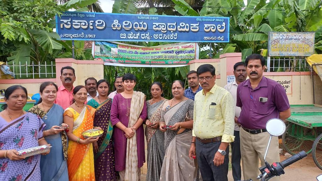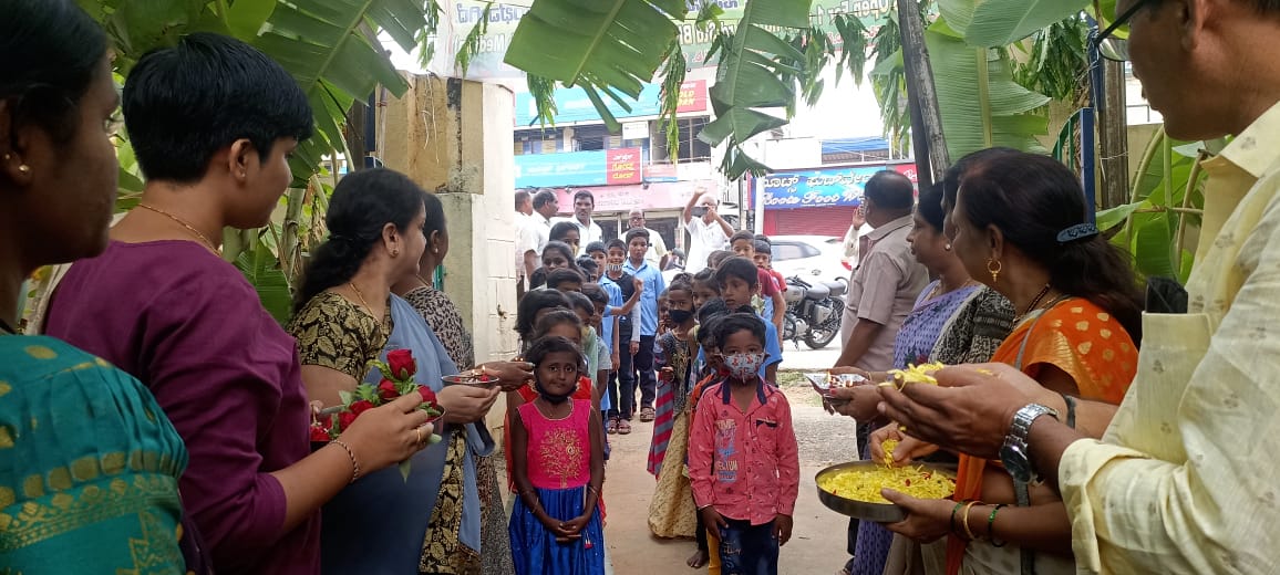 on school reopening, School students are welcomed by our Inner wheel Members and Tehsildar Vidya Rathod ,BEO Mohan kumar ,School Head Mistress Shoba and teachers, staffs we all welcome the students to school by giving sweets flowers books.