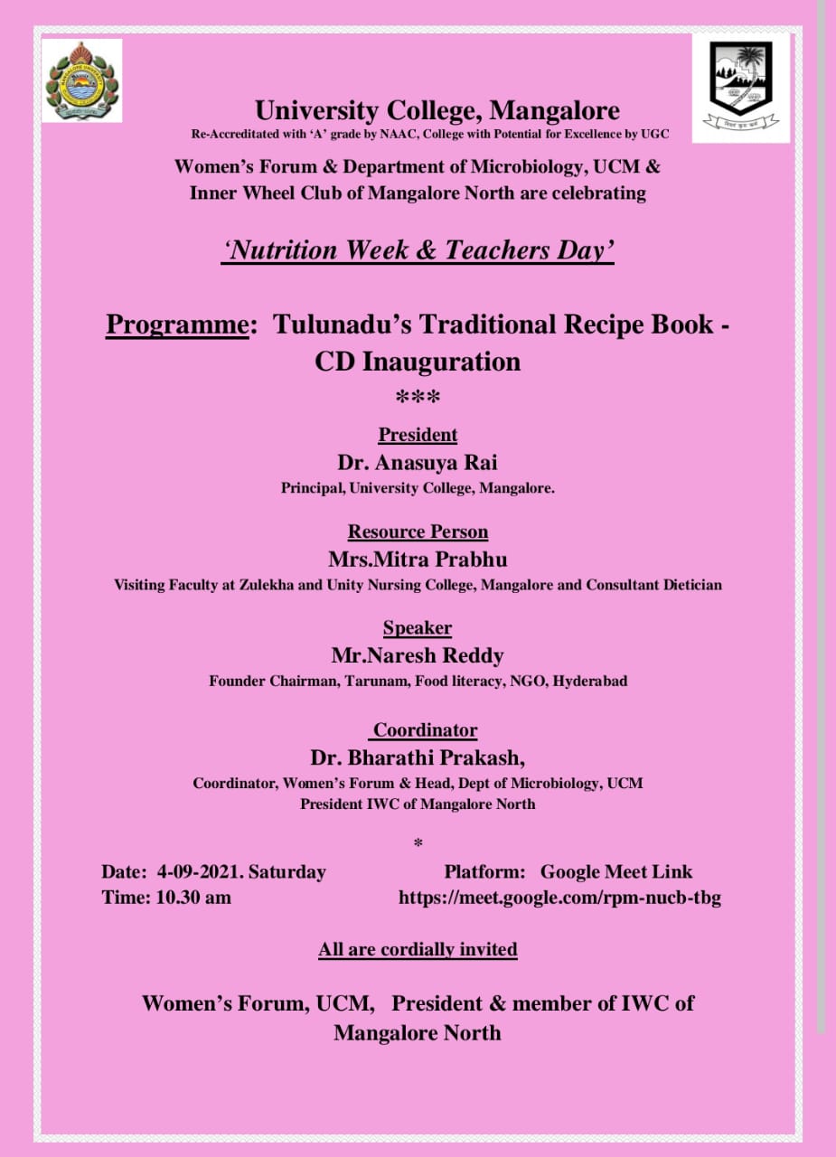 Inner wheel club of Mangalore North jointly with University College,Mangalore celebrated Nutrition week in a very unique way. BSc Microbiology students of Dr Bharathi Prakash , of University College had prepared the 100 local healthy Tulunadu Recipes with the help of their grand parents and parents.