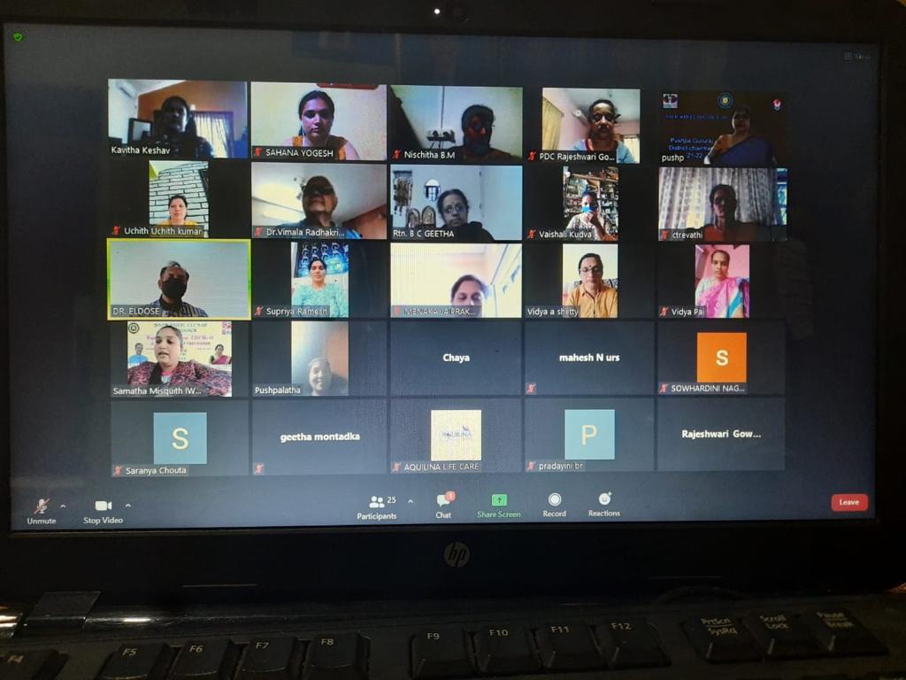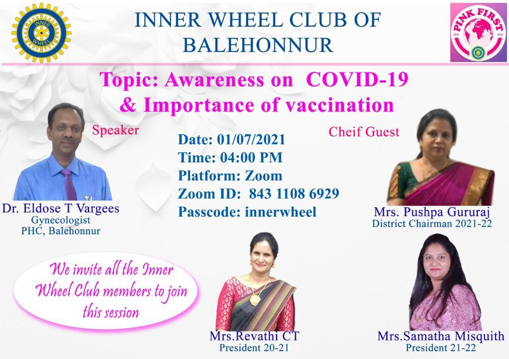 Dr. Eldose Vargeese, Gynecologist from Balehonnur PHC, addressed a zoom meet about importance of getting vaccinated and facts and myths about vaccination. DC Mrs. Pushpa Gururaj was invited as chief guest and several members from our club and other club participated.
