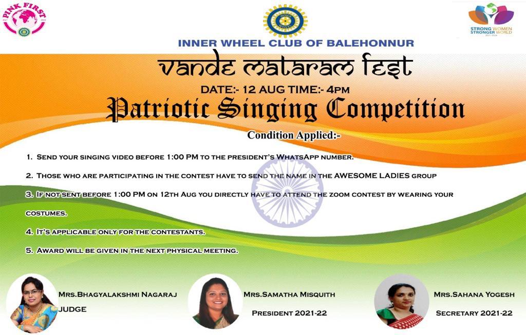 As part of Vandhe Mataram fest a Virtual patriotic singing competition was organized for the club members. Mrs. Bhagyalakshmi Nagraj from Tumkur Metro club from district 319 was invited as judge and winners were chosen.