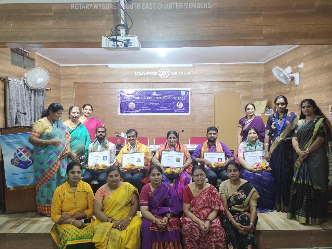 We celebrated Teachers day by honouring 5 Eminent Teachers of various teaching profession a1. Yoga trainer, 2. Director in Theaters, 3. Basketball coach, 4.Professor in All Inda Institute of Speech And Hearing and 5.Principal of Rotary highschool to show our respect and gratitude to the Teachers who shape our life , with Innerwheel citation, shawls, fruit bowls and garlands.