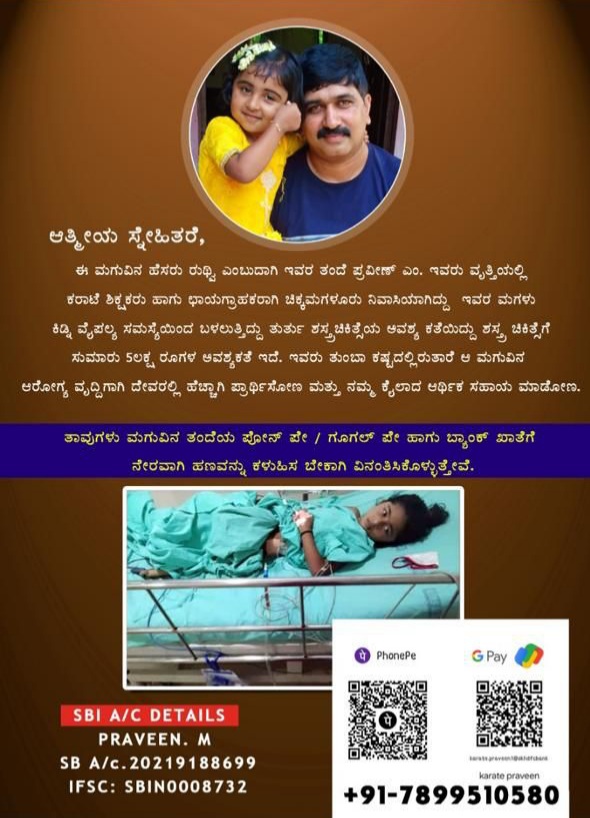 “No act of kindness, no matter how small, is ever wasted.” Our members have generously contributed towards the medical aid of Baby Ruthvi, daughter of Mr. Praveen, a Karate tutor in Chikmagalur. We pray for the speedy recovery of Baby Ruthvi.