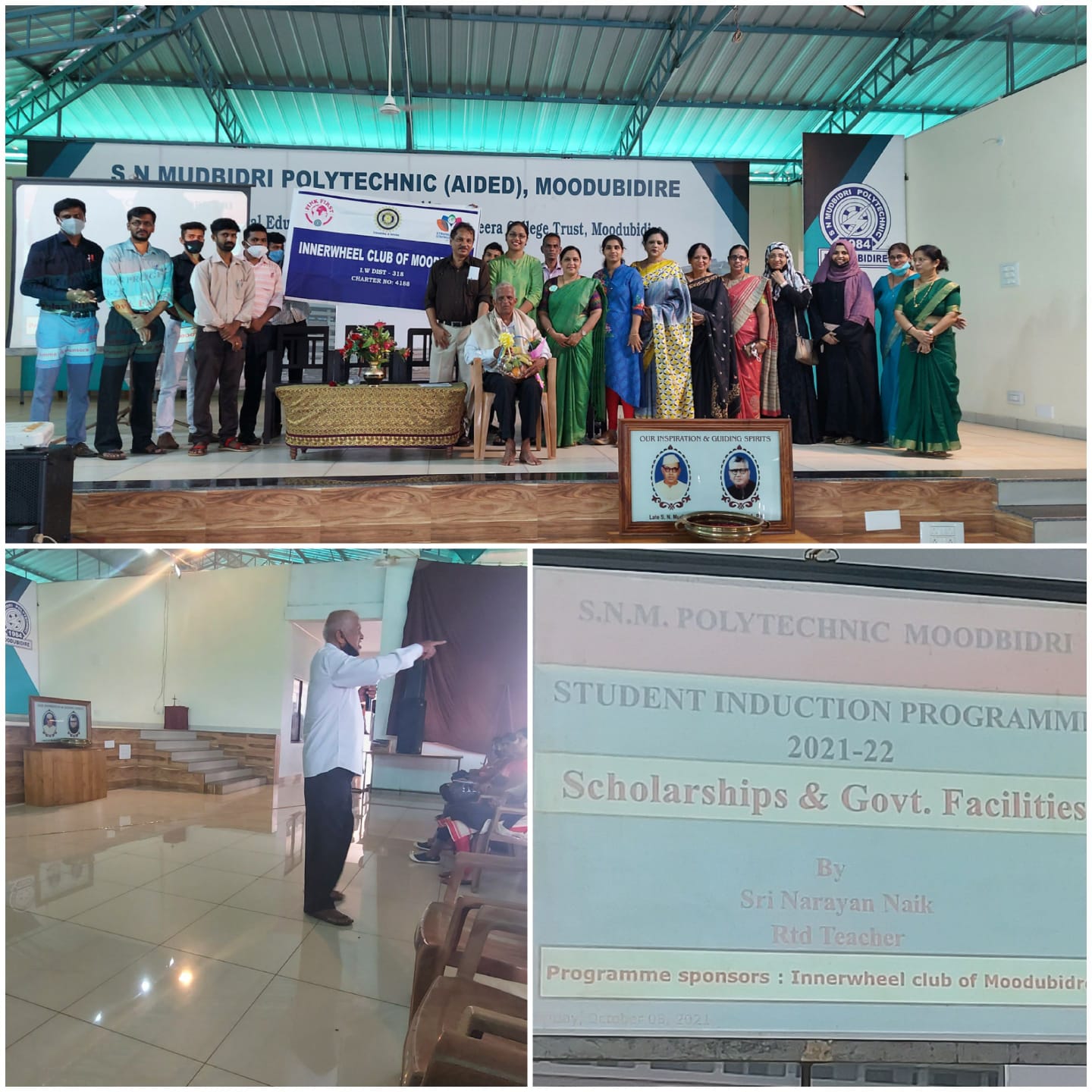 During the Induction of first Year Students at S N M Polytechnic , Moodbidri arranged an Awareness talk on various scholarships and schemes available for students to continue their education. The talk was given by Retired Teacher and Head Master Mr. Narayan Naik , aged 79 years who selflessly visits all colleges and gives these informations.