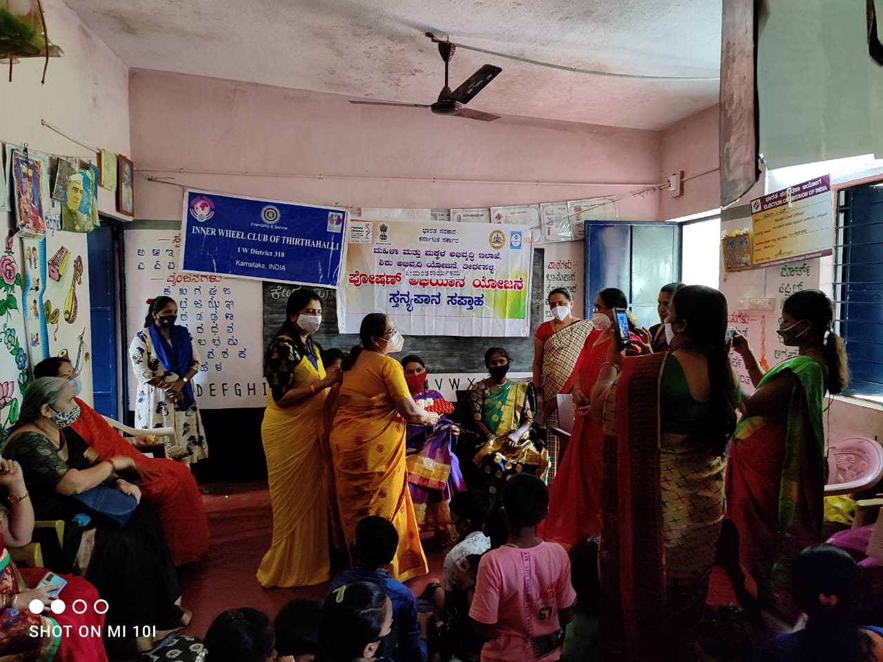 Our club members with the president have honoured four pregnant women by celebrating seemantha at Anganavadi kendra, Horabylu, Thirthahalli taluk, on 07/08/2021.