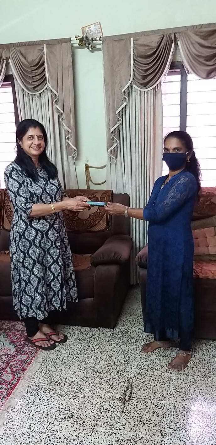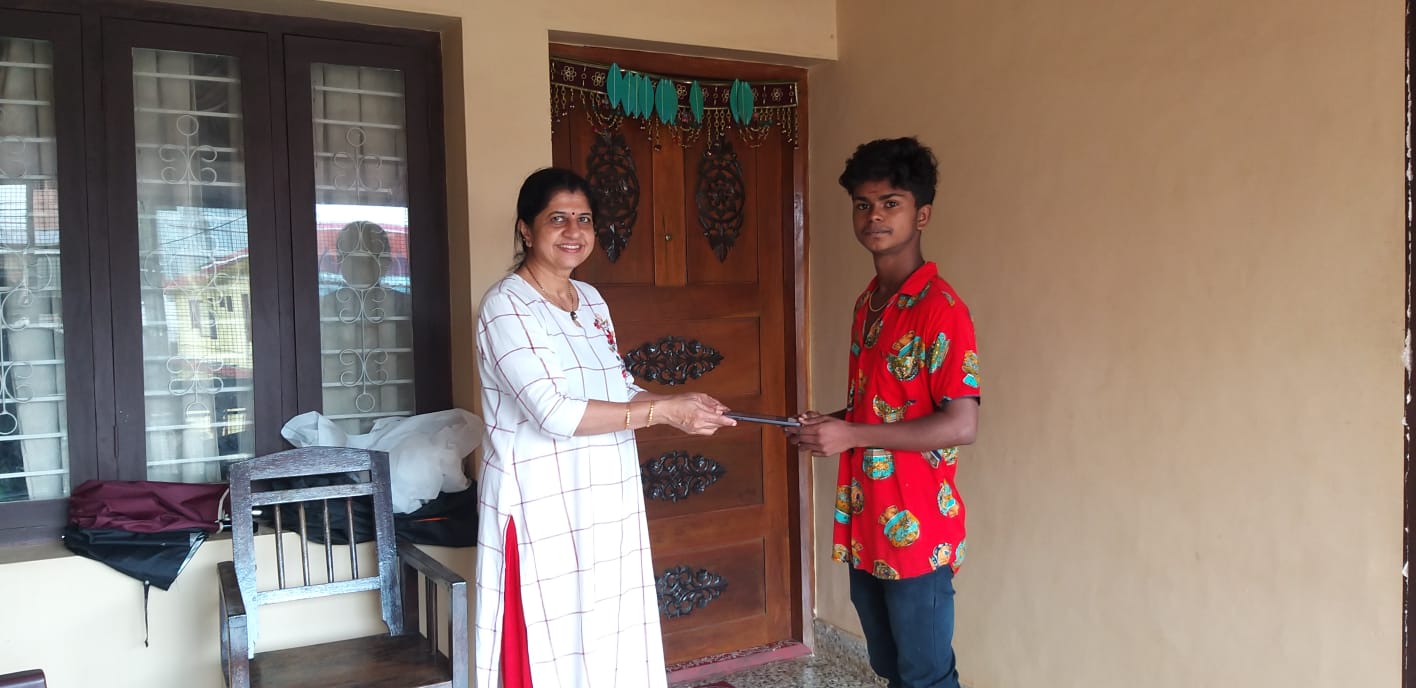 A laptop and a smart phone are distributed to two PUC studying students at President's residence on 07/09/2021. These items are contributed by our club president Smt. Bhagya Ithal.