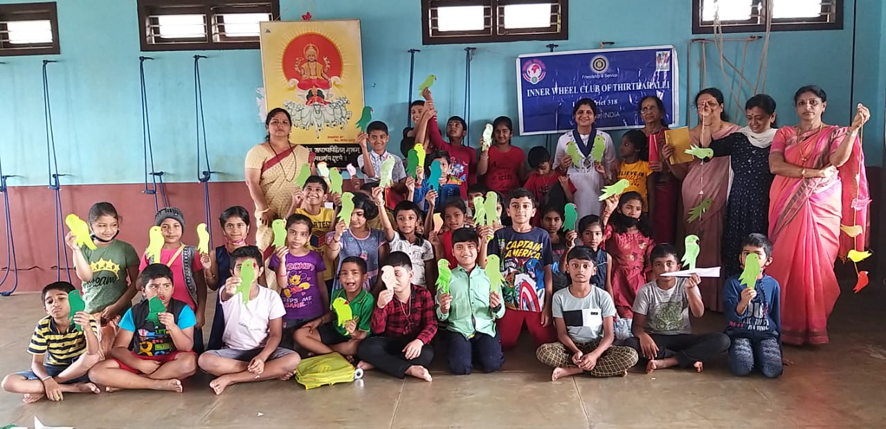 On 14th Nov.2021, we have celebrated childrens' day at Prerana Hall, Thirthahalli. A craft class is conducted by our editor Smt. Vasanthi Manjunath for students. Waste materials like invitation cards are used for making birds, parrots etc. The students enjoyed the class and made the craft items. Colour papers, sweet, chocolates are given by our club.